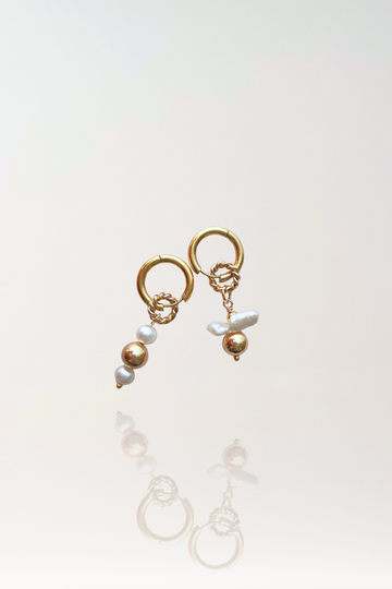 Les boucles SATELLITES sont une ode à la différence, à la beauté brute des perles et au jeu des contrastes. Montées sur des créoles en acier inoxydable doré, elles mêlent :